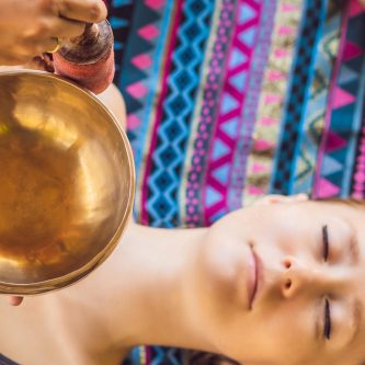Bei einer Klangmassage werden Klangschalen auf den bekleideten Körper gestellt und sanft angeschlagen.